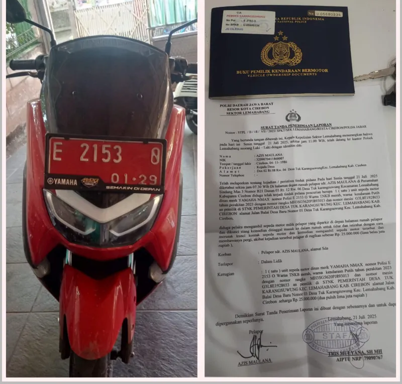 Kabupaten Cirebon – Sudah satu minggu lebih, pasca kejadian pencurian sepeda motor ditempat kediaman Kepala Desa (Kades ) atau Kuwu, Azis Maulana Desa Tuk Karangsuwung, Kecamatan Lemahabang, Kabupaten Cirebon, Provinsi Jawa Barat pada hari Senin (21/7/2025 ) sekitar pukul 02.28 WIB, kedua pelaku pencuri menggondol 1 (satu) Unit Sepeda Motor Dinas Yamaha NMX Nopol : E 2153 O, warna TNKB merah,Tahun perakitan 2023.(31/07/2025).